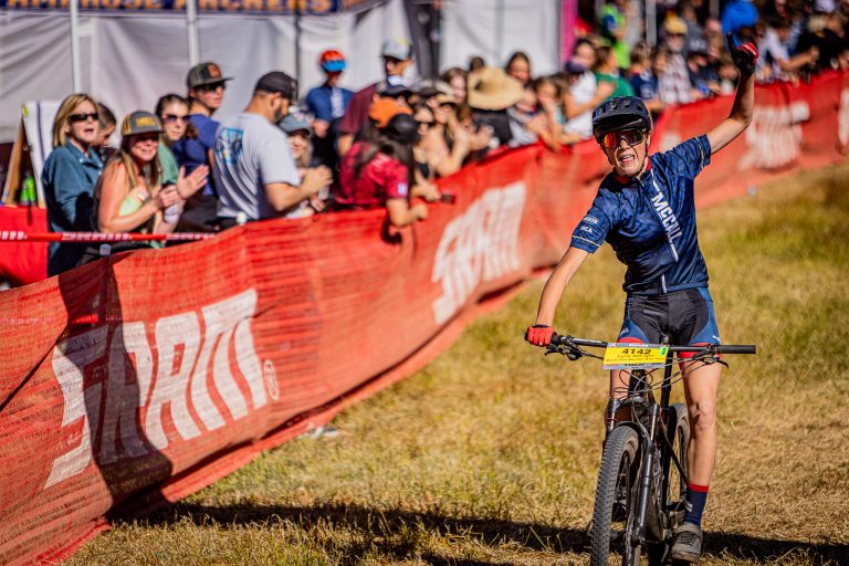 Lyric Albright crosses the finish line in first place in the freshman girls race at Jug Mountain Ranch on Saturday. Photo by Adam Haynes/Idaho Interscholastic Cycling League.