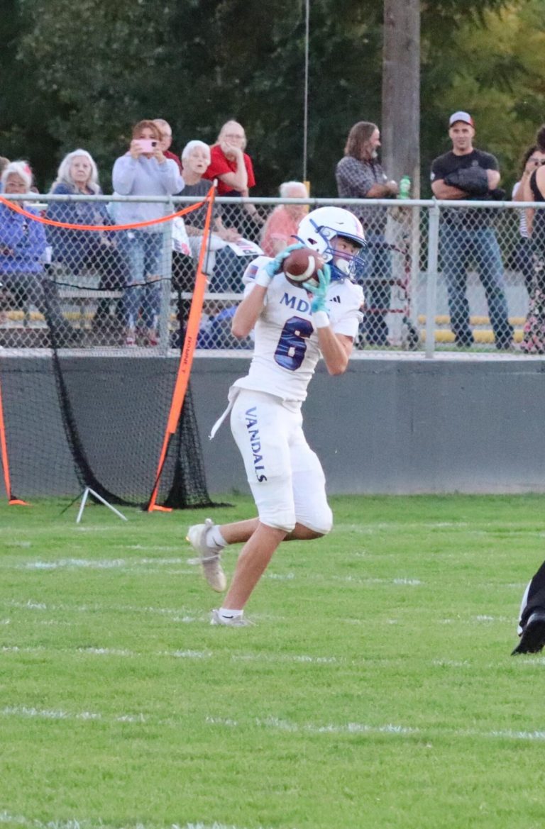 Vandal receiver Easton Allen snares a pass as the McCall-Donnelly football team defeated Payette, 39-7, on Friday, Oct. 10, in Payette.Photo courtesy of Andrea Joyce